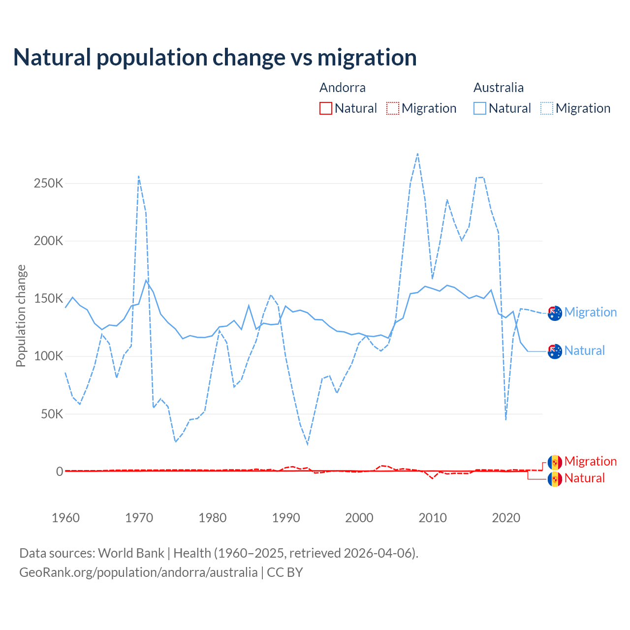Over the last 10 years, 16.2% of the population change in Andorra is from natural causes (a gain of 1,123 people) and 83.8% is from migration (a gain of 5,802 people). In Australia 43.6% is from natural causes (a gain of 1,389,408 people) and 56.4% is from migration (a gain of 1,798,171 people).
