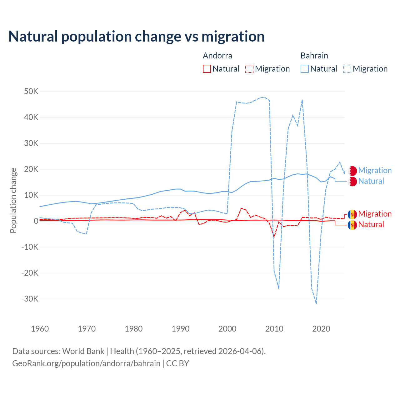 Over the last 10 years, 16.2% of the population change in Andorra is from natural causes (a gain of 1,123 people) and 83.8% is from migration (a gain of 5,802 people). In Bahrain 55.9% is from natural causes (a gain of 170,110 people) and 44.1% is from migration (a gain of 134,281 people).