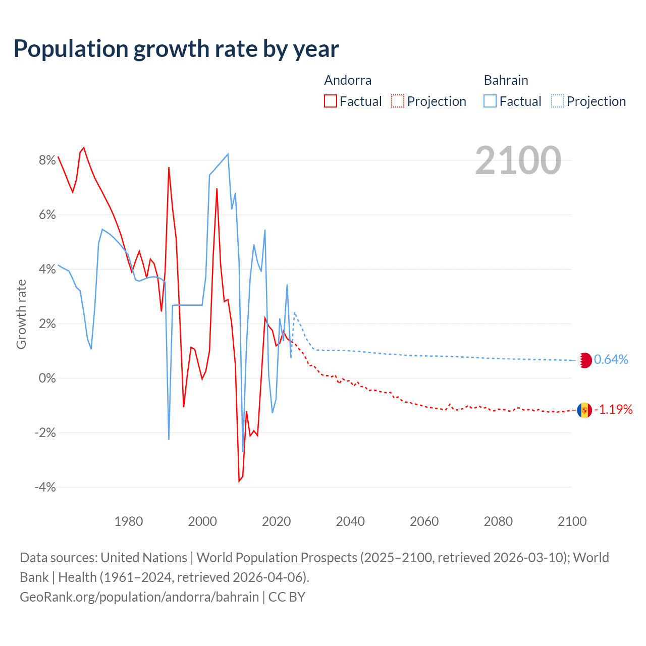 - For the last 10 years, Andorra has had an average growth rate of +0.79% per year vs +2.2% in Bahrain.