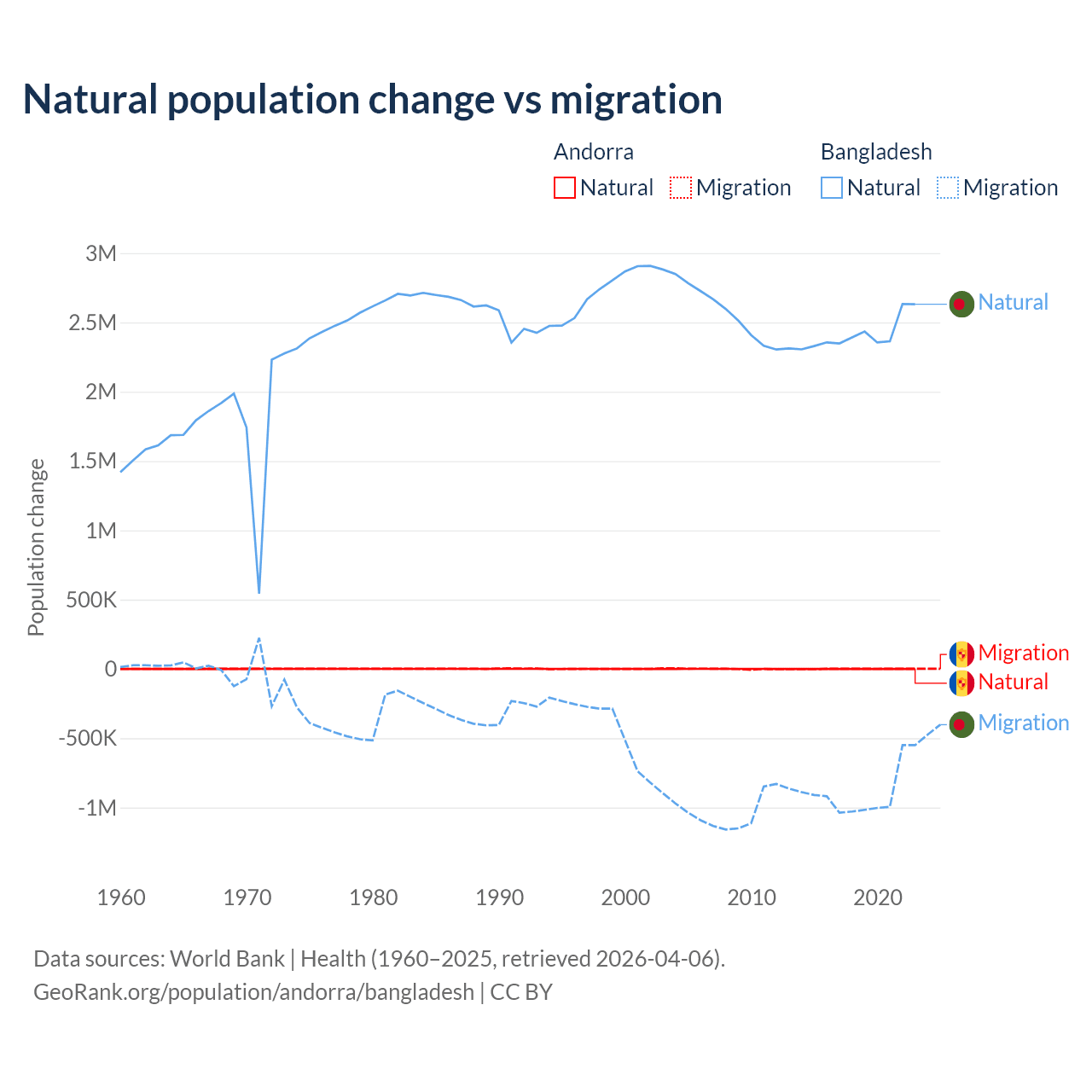Over the last 10 years, 16.2% of the population change in Andorra is from natural causes (a gain of 1,123 people) and 83.8% is from migration (a gain of 5,802 people). In Bangladesh 73.1% is from natural causes (a gain of 24,148,039 people) and 26.9% is from migration (a loss of 8,897,408 people).