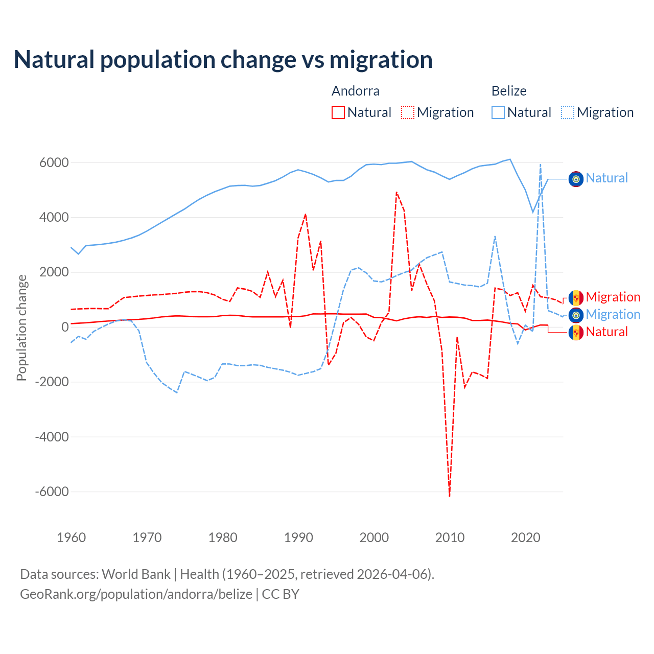 Over the last 10 years, 16.2% of the population change in Andorra is from natural causes (a gain of 1,123 people) and 83.8% is from migration (a gain of 5,802 people). In Belize 79.6% is from natural causes (a gain of 54,754 people) and 20.4% is from migration (a gain of 14,073 people).