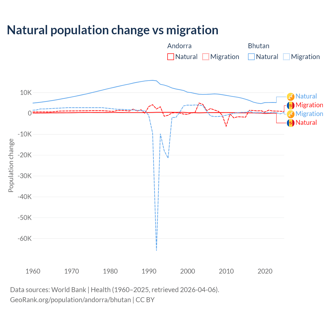 Over the last 10 years, 16.2% of the population change in Andorra is from natural causes (a gain of 1,123 people) and 83.8% is from migration (a gain of 5,802 people). In Bhutan 93.3% is from natural causes (a gain of 55,796 people) and 6.74% is from migration (a gain of 4,035 people).