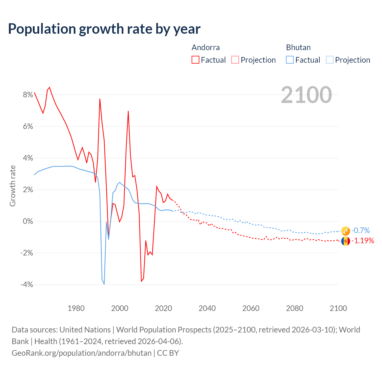 - For the last 10 years, Andorra has had an average growth rate of +0.79% per year vs +0.8% in Bhutan.