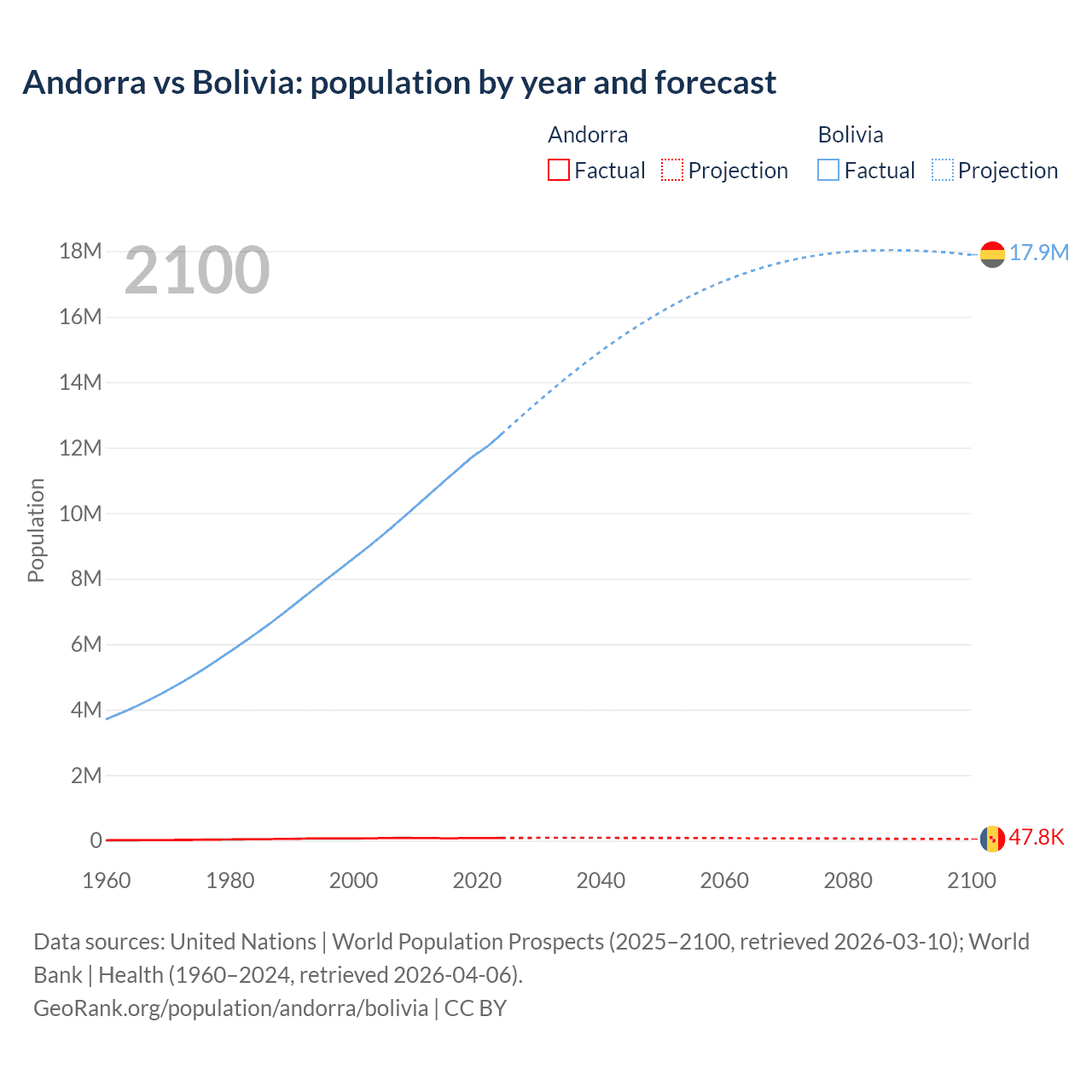 The latest officially reported population of Andorra was 81,938 in 2024 vs 12,413,315 people in Bolivia in 2024. In 2026, based on the adjusted UN estimation, the current Andorra's population is 84,102 people compared to 12,798,112 in Bolivia.