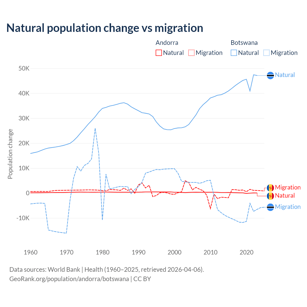 Over the last 10 years, 16.2% of the population change in Andorra is from natural causes (a gain of 1,123 people) and 83.8% is from migration (a gain of 5,802 people). In Botswana 82.5% is from natural causes (a gain of 436,373 people) and 17.5% is from migration (a loss of 92,293 people).