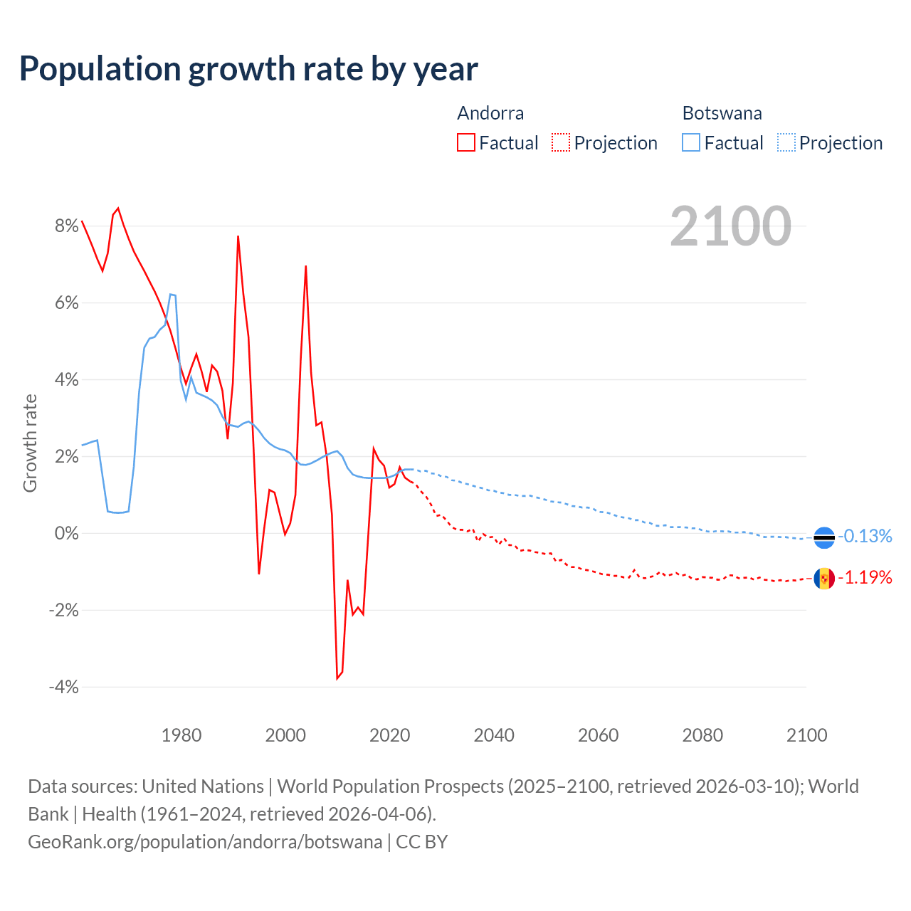 - For the last 10 years, Andorra has had an average growth rate of +0.79% per year vs +1.5% in Botswana.