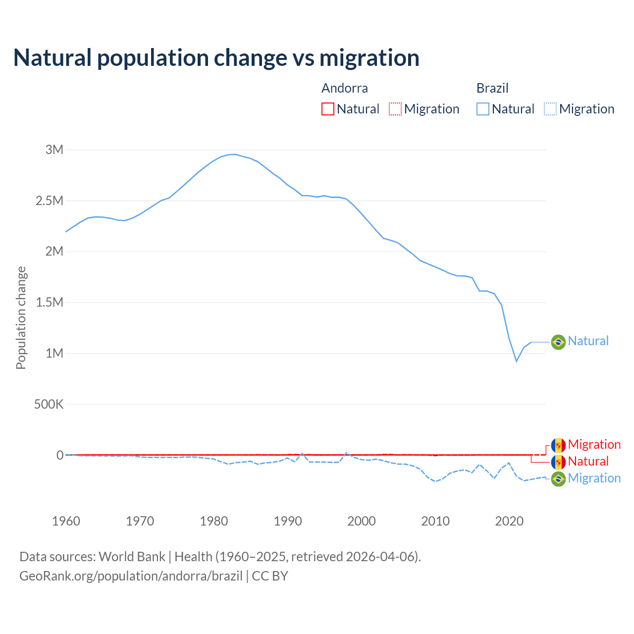 Over the last 10 years, 16.2% of the population change in Andorra is from natural causes (a gain of 1,123 people) and 83.8% is from migration (a gain of 5,802 people). In Brazil 89.1% is from natural causes (a gain of 14,004,164 people) and 10.9% is from migration (a loss of 1,708,894 people).