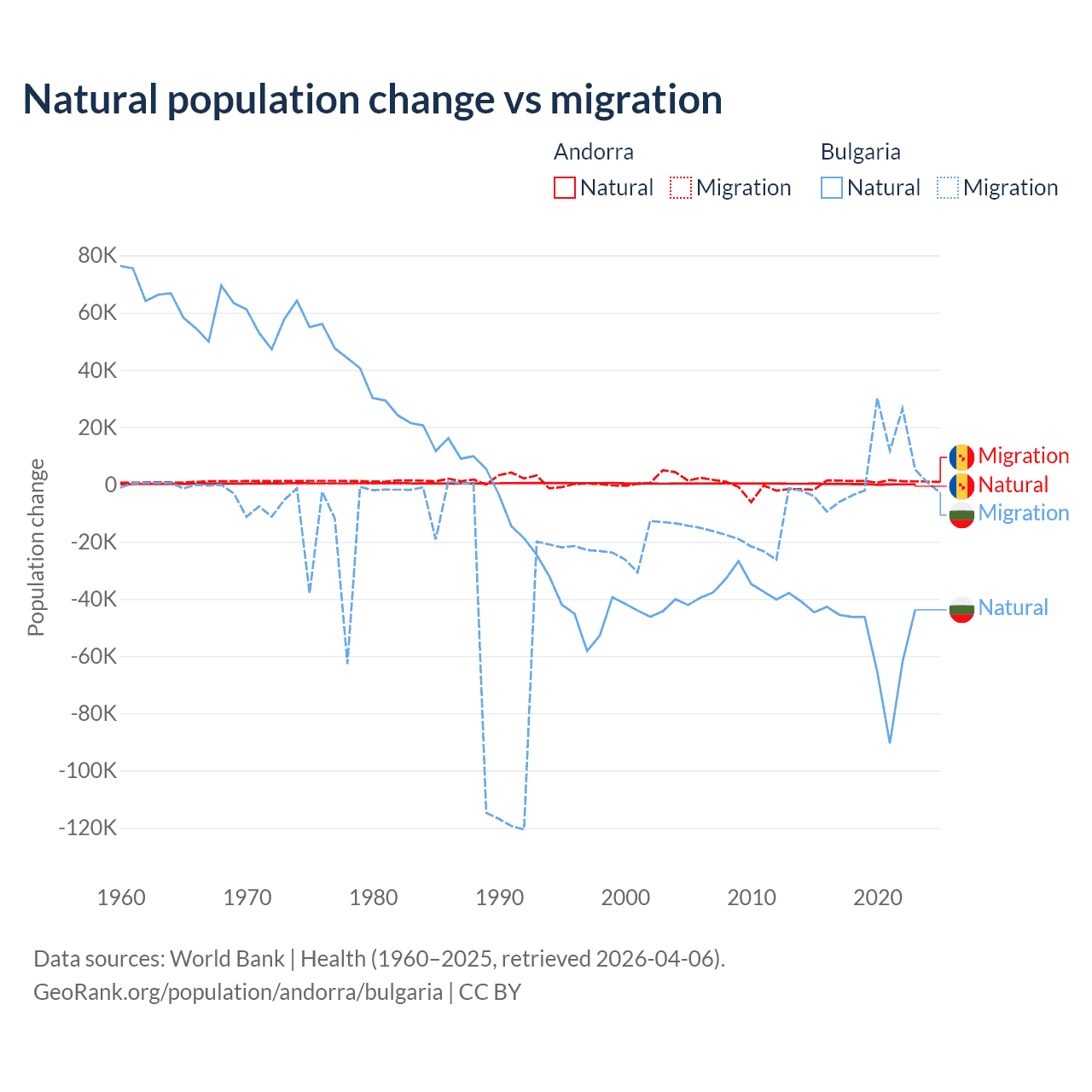 Over the last 10 years, 16.2% of the population change in Andorra is from natural causes (a gain of 1,123 people) and 83.8% is from migration (a gain of 5,802 people). In Bulgaria 92.1% is from natural causes (a loss of 528,535 people) and 7.94% is from migration (a gain of 45,567 people).
