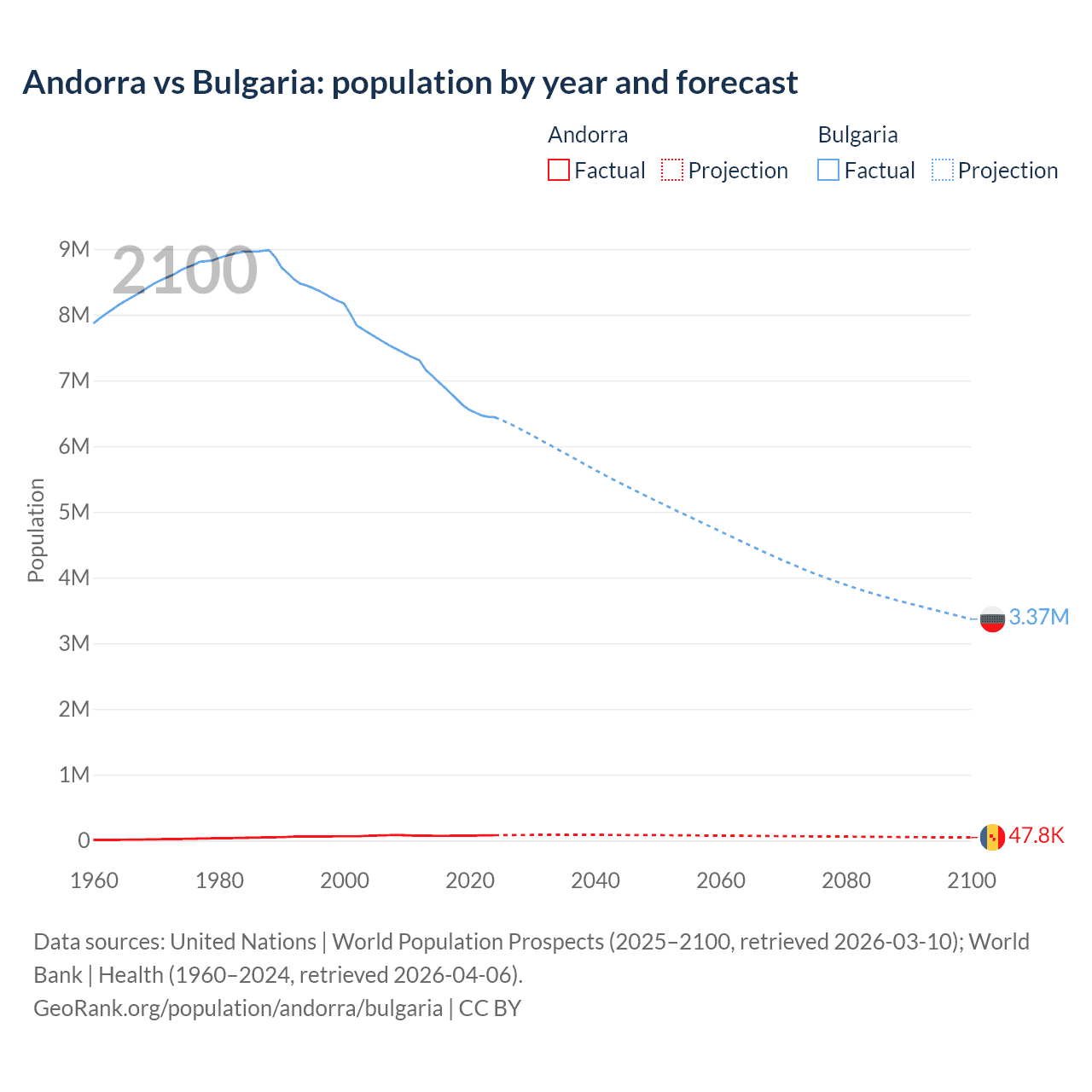 Andorra vs Bulgaria: population by year and forecast