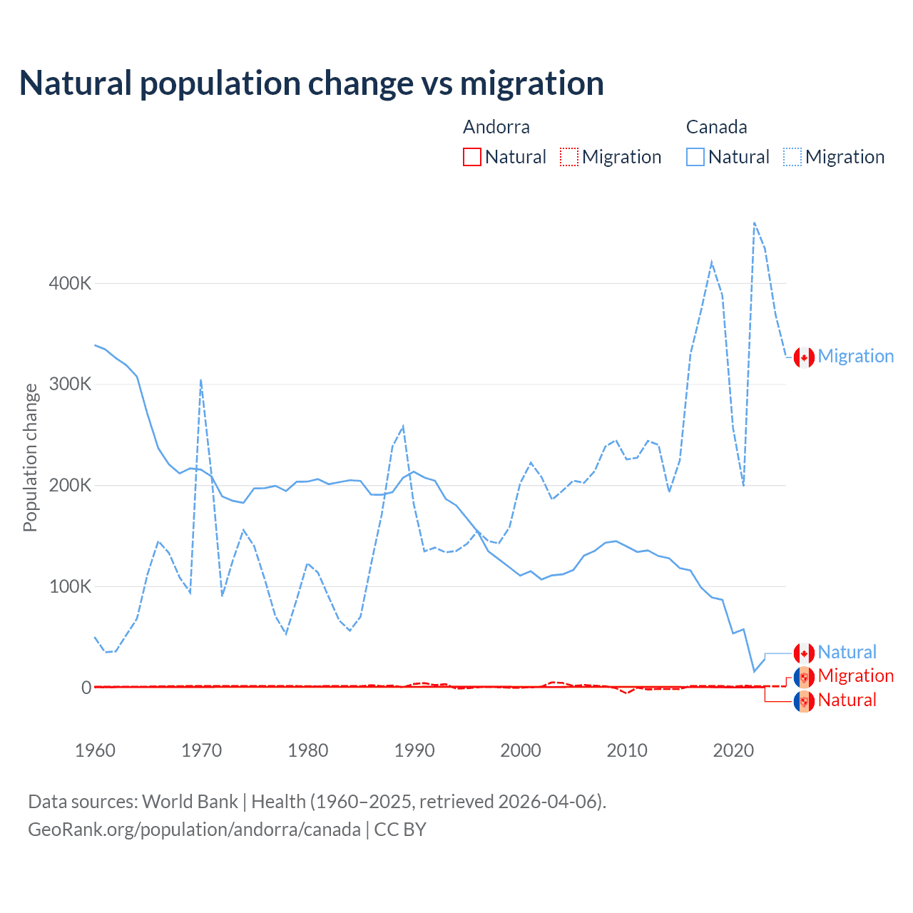 Over the last 10 years, 16.2% of the population change in Andorra is from natural causes (a gain of 1,123 people) and 83.8% is from migration (a gain of 5,802 people). In Canada 19.4% is from natural causes (a gain of 789,345 people) and 80.6% is from migration (a gain of 3,276,554 people).