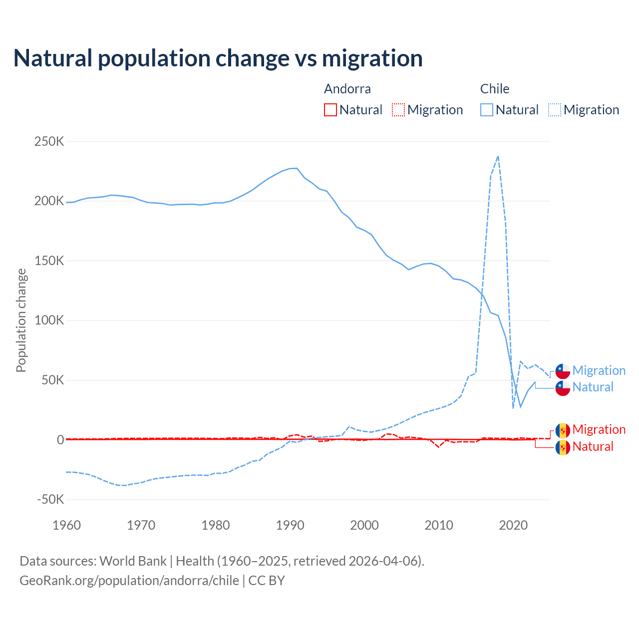 Over the last 10 years, 16.2% of the population change in Andorra is from natural causes (a gain of 1,123 people) and 83.8% is from migration (a gain of 5,802 people). In Chile 43.5% is from natural causes (a gain of 844,683 people) and 56.5% is from migration (a gain of 1,097,597 people).