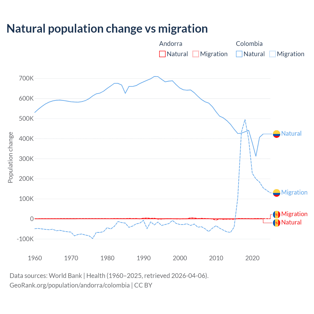 Over the last 10 years, 16.2% of the population change in Andorra is from natural causes (a gain of 1,123 people) and 83.8% is from migration (a gain of 5,802 people). In Colombia 66.6% is from natural causes (a gain of 4,162,856 people) and 33.4% is from migration (a gain of 2,083,051 people).