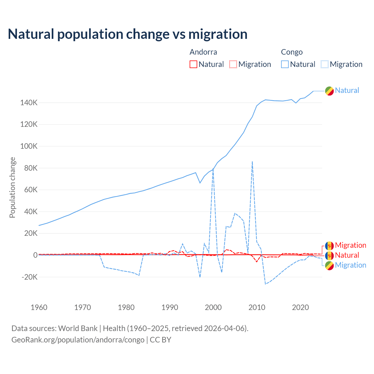 Over the last 10 years, 16.2% of the population change in Andorra is from natural causes (a gain of 1,123 people) and 83.8% is from migration (a gain of 5,802 people). In the Congo 94% is from natural causes (a gain of 1,434,056 people) and 6.04% is from migration (a loss of 92,251 people).