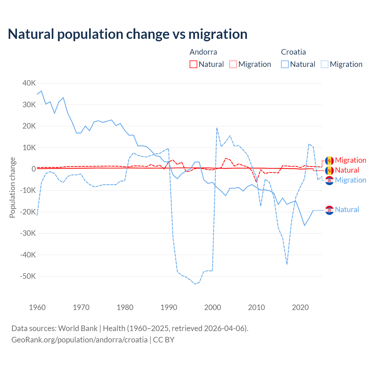 Over the last 10 years, 16.2% of the population change in Andorra is from natural causes (a gain of 1,123 people) and 83.8% is from migration (a gain of 5,802 people). In Croatia 54.8% is from natural causes (a loss of 177,803 people) and 45.2% is from migration (a loss of 146,770 people).