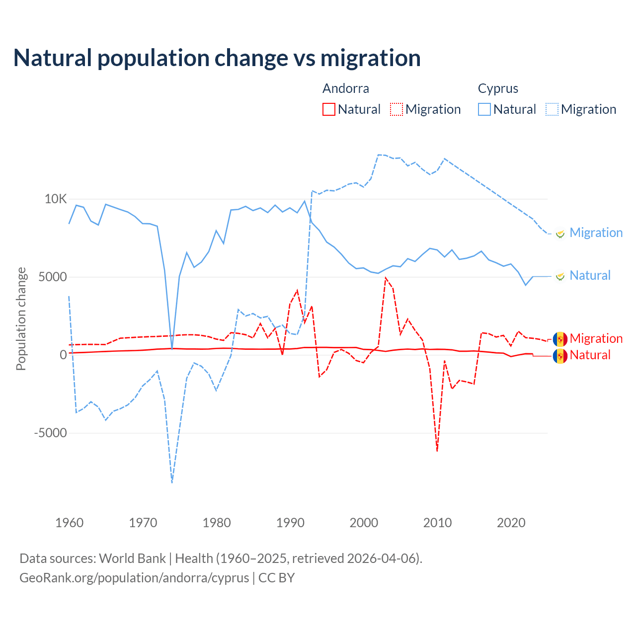 Over the last 10 years, 16.2% of the population change in Andorra is from natural causes (a gain of 1,123 people) and 83.8% is from migration (a gain of 5,802 people). In Cyprus 36.2% is from natural causes (a gain of 57,464 people) and 63.8% is from migration (a gain of 101,458 people).