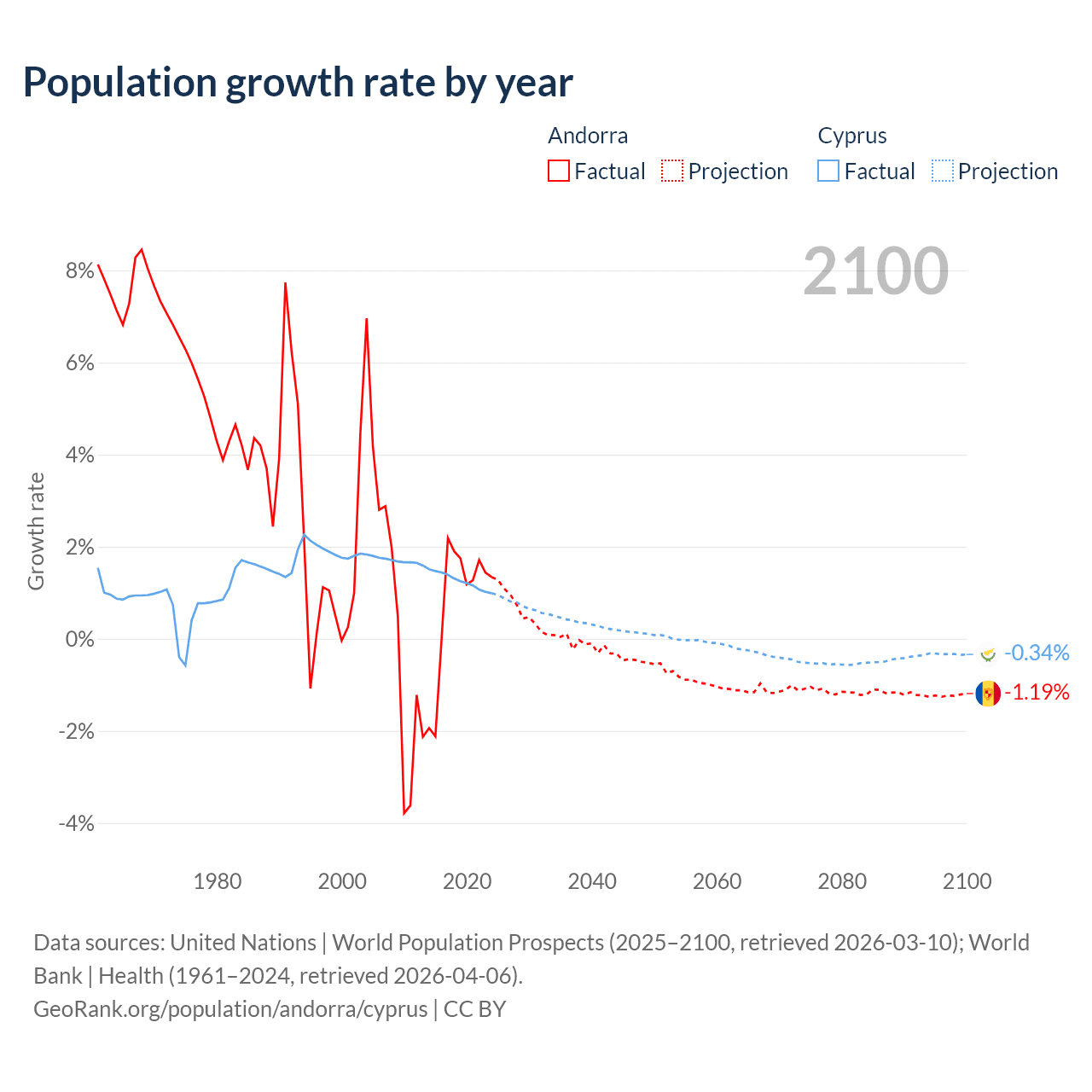 - For the last 10 years, Andorra has had an average growth rate of +0.79% per year vs +1.26% in Cyprus.