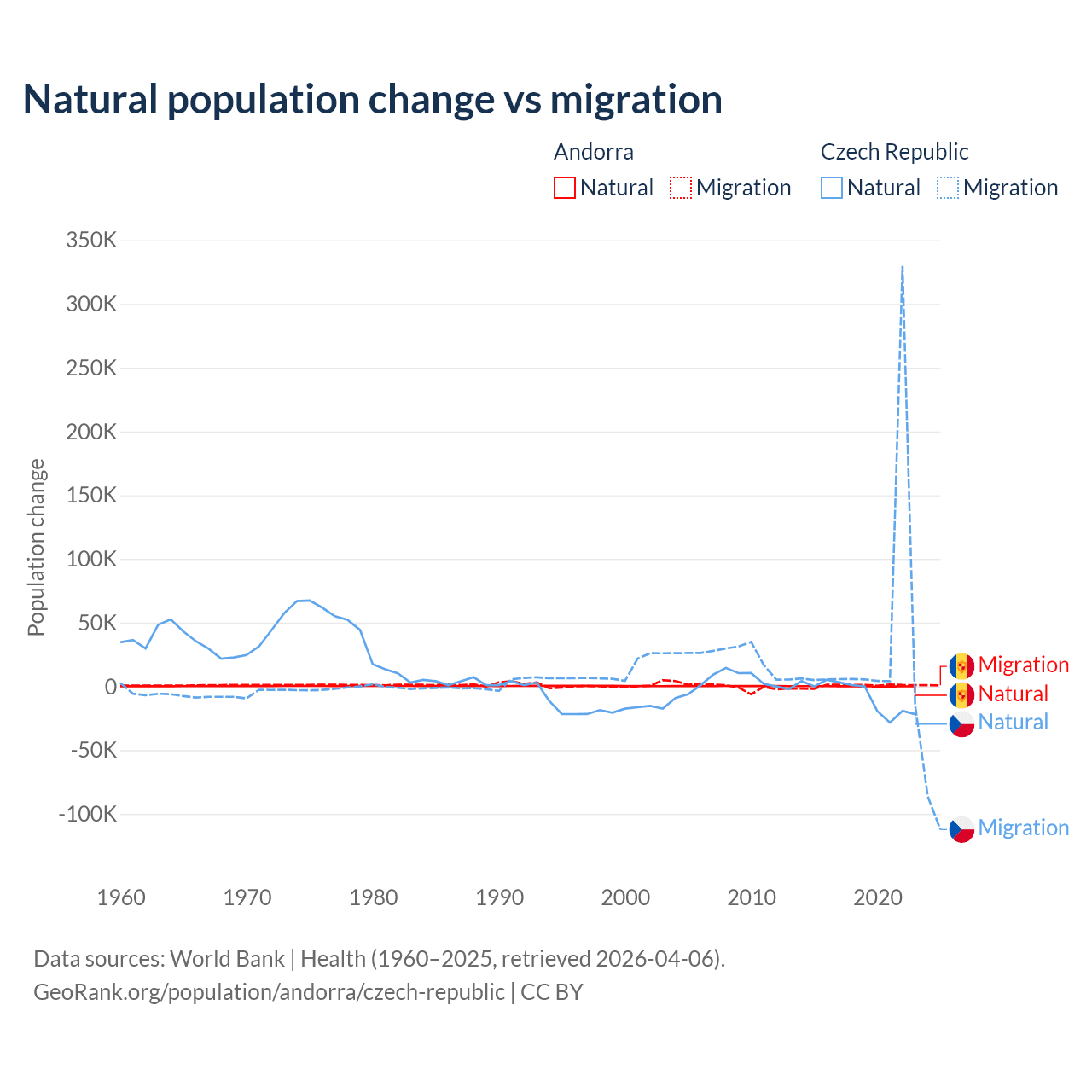 Over the last 10 years, 16.2% of the population change in Andorra is from natural causes (a gain of 1,123 people) and 83.8% is from migration (a gain of 5,802 people). In the Czech Republic 17.3% is from natural causes (a loss of 74,826 people) and 82.7% is from migration (a gain of 357,502 people).