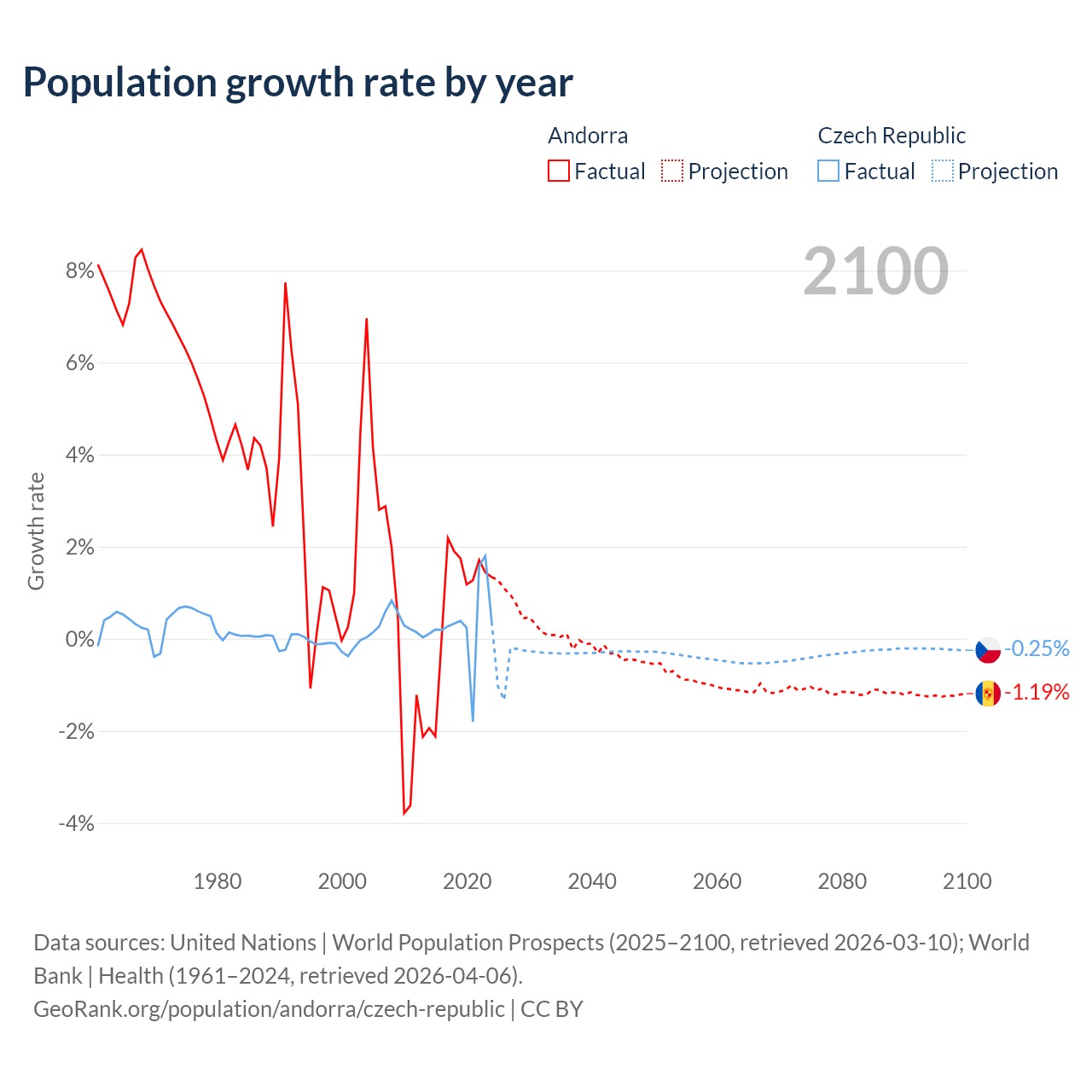- For the last 10 years, Andorra has had an average growth rate of +0.79% per year vs +0.34% in the Czech Republic.