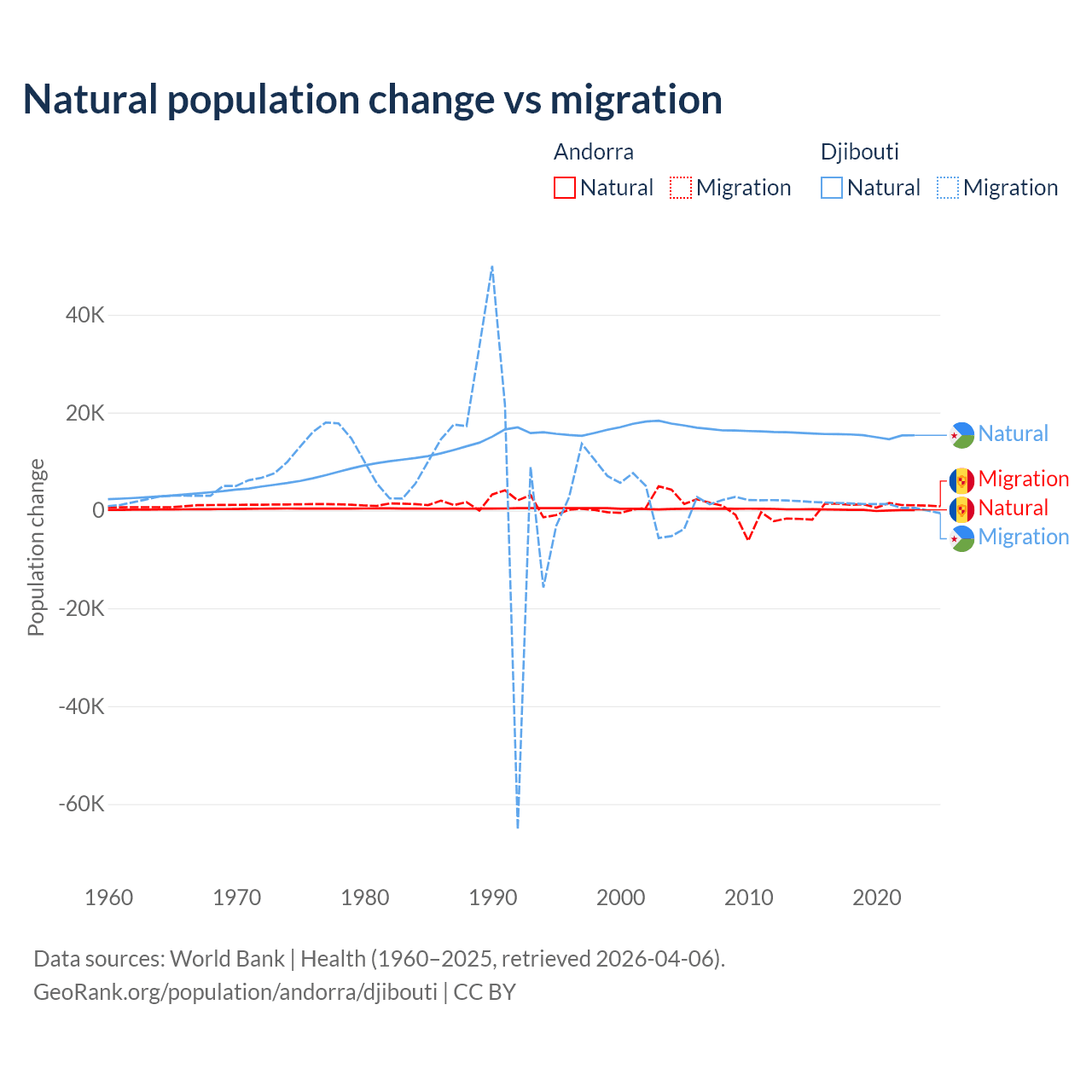 Over the last 10 years, 16.2% of the population change in Andorra is from natural causes (a gain of 1,123 people) and 83.8% is from migration (a gain of 5,802 people). In Djibouti 92.1% is from natural causes (a gain of 153,892 people) and 7.87% is from migration (a gain of 13,138 people).
