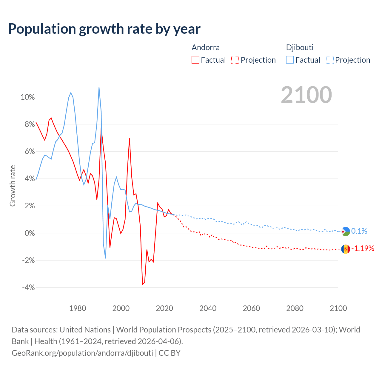 - For the last 10 years, Andorra has had an average growth rate of +0.79% per year vs +1.57% in Djibouti.