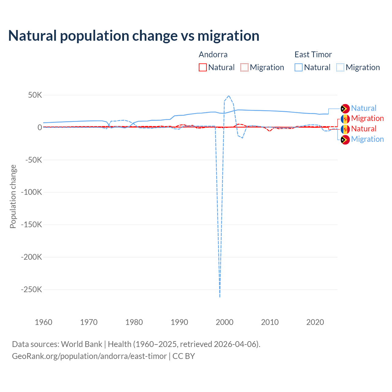 Over the last 10 years, 16.2% of the population change in Andorra is from natural causes (a gain of 1,123 people) and 83.8% is from migration (a gain of 5,802 people). In East Timor 98.3% is from natural causes (a gain of 217,698 people) and 1.66% is from migration (a gain of 3,665 people).