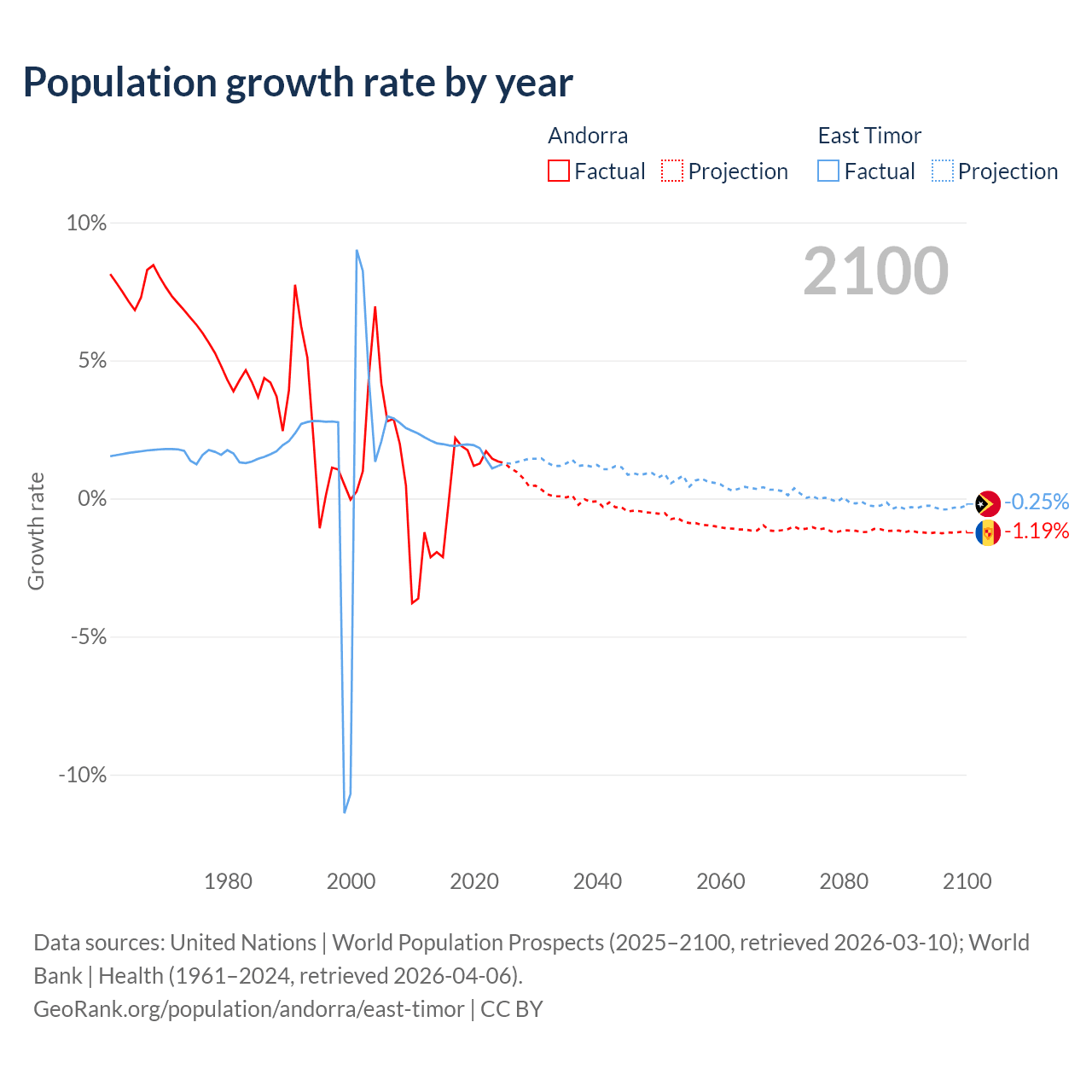 - For the last 10 years, Andorra has had an average growth rate of +0.79% per year vs +1.74% in East Timor.