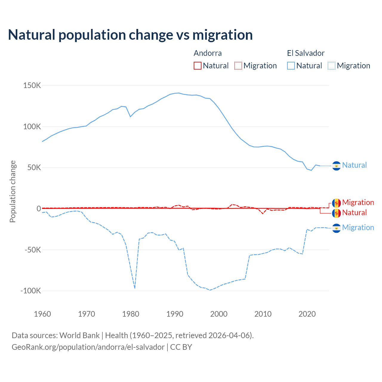 Over the last 10 years, 16.2% of the population change in Andorra is from natural causes (a gain of 1,123 people) and 83.8% is from migration (a gain of 5,802 people). In El Salvador 58.8% is from natural causes (a gain of 579,641 people) and 41.2% is from migration (a loss of 406,874 people).