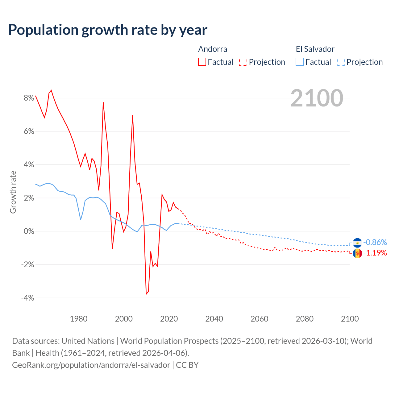 - For the last 10 years, Andorra has had an average growth rate of +0.79% per year vs +0.29% in El Salvador.