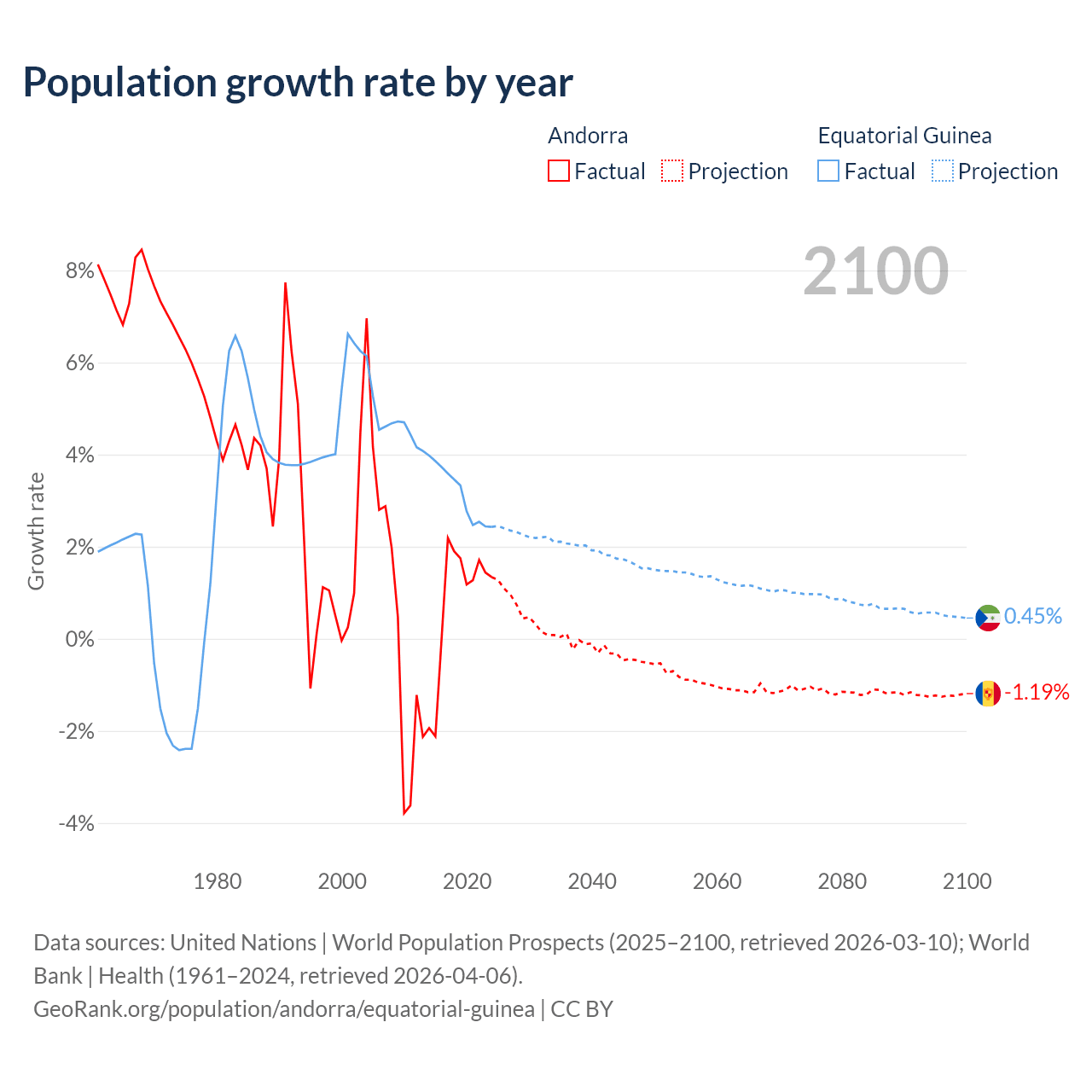 - For the last 10 years, Andorra has had an average growth rate of +0.79% per year vs +3.15% in Equatorial Guinea.
