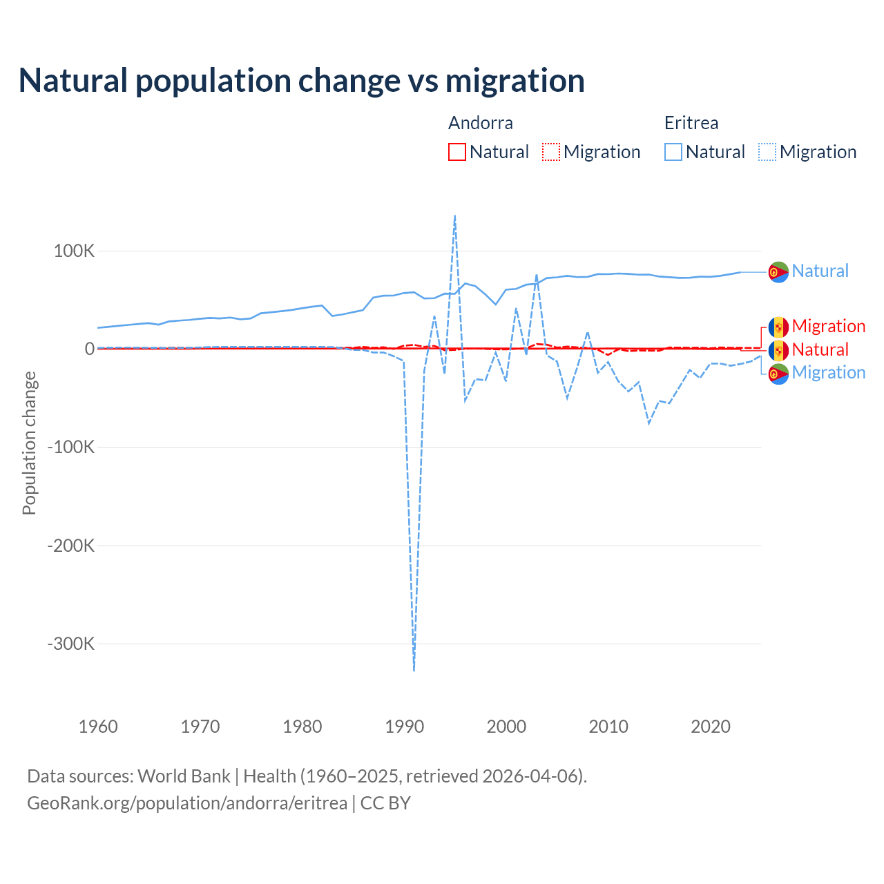 Over the last 10 years, 16.2% of the population change in Andorra is from natural causes (a gain of 1,123 people) and 83.8% is from migration (a gain of 5,802 people). In Eritrea 68.8% is from natural causes (a gain of 742,837 people) and 31.2% is from migration (a loss of 336,243 people).