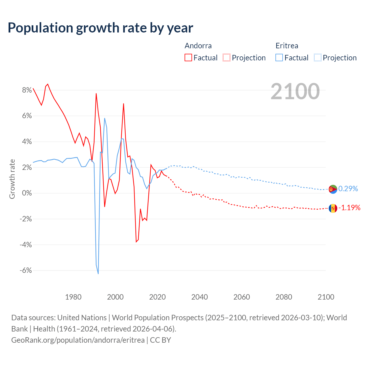 - For the last 10 years, Andorra has had an average growth rate of +0.79% per year vs +1.28% in Eritrea.