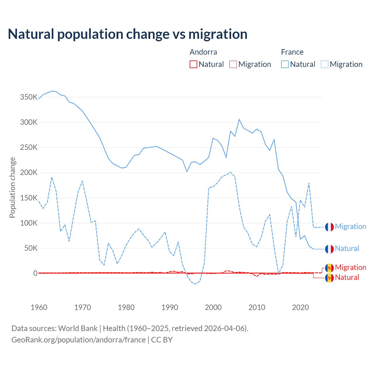 Over the last 10 years, 16.2% of the population change in Andorra is from natural causes (a gain of 1,123 people) and 83.8% is from migration (a gain of 5,802 people). In France 59.5% is from natural causes (a gain of 1,359,540 people) and 40.5% is from migration (a gain of 923,723 people).