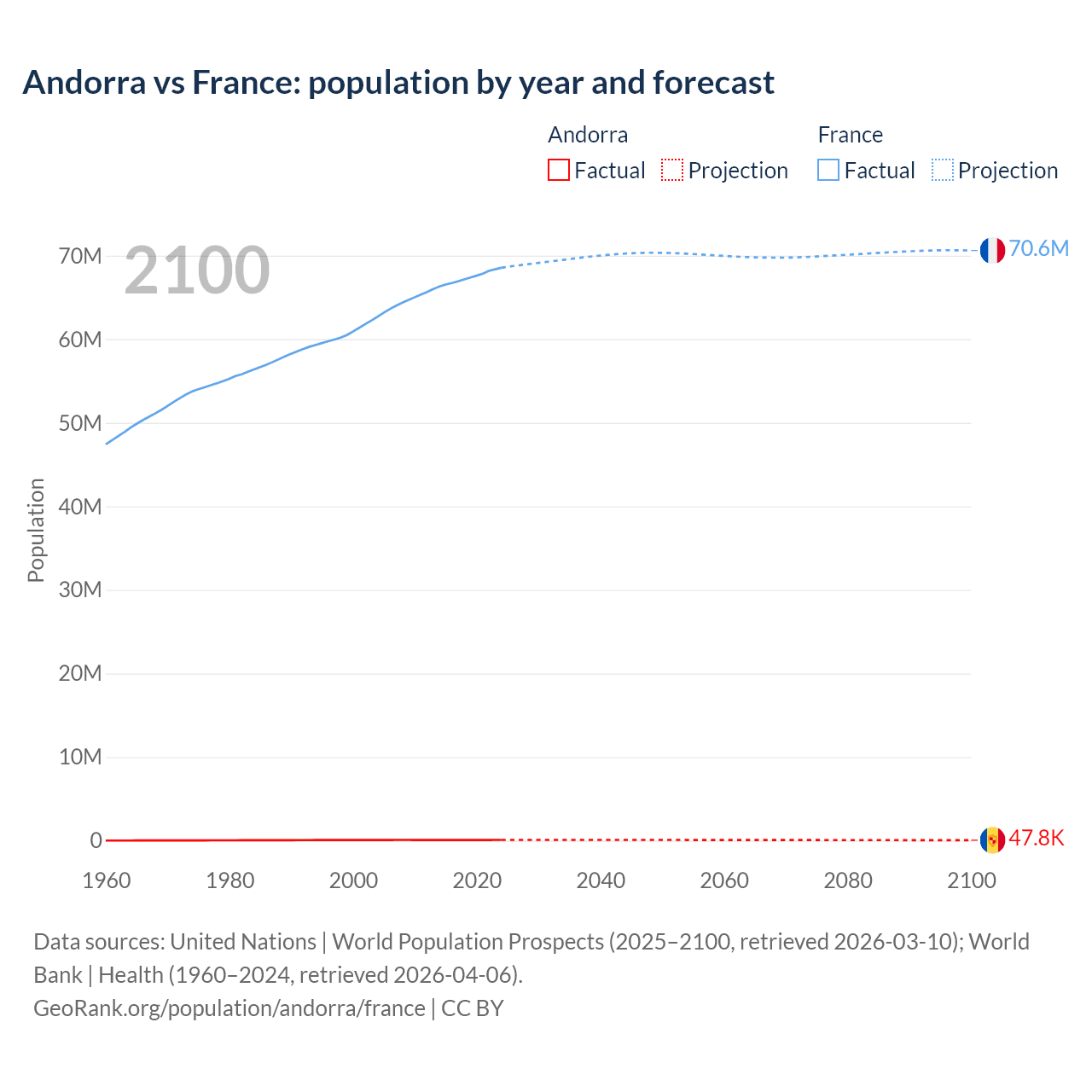 The latest officially reported population of Andorra was 81,938 in 2024 vs 68,551,653 people in France in 2024. In 2026, based on the adjusted UN estimation, the current Andorra's population is 84,102 people compared to 68,788,006 in France.