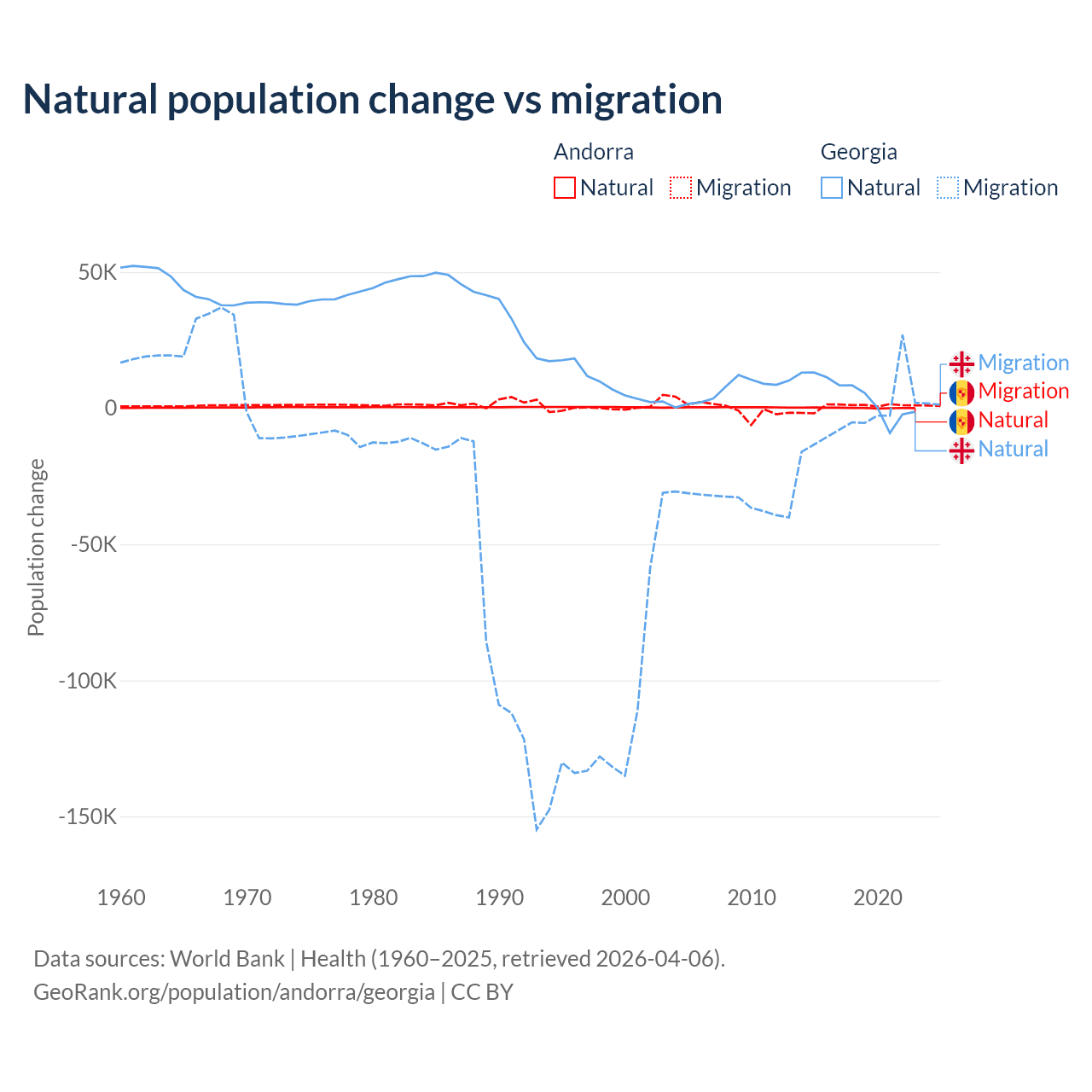 Over the last 10 years, 16.2% of the population change in Andorra is from natural causes (a gain of 1,123 people) and 83.8% is from migration (a gain of 5,802 people). In Georgia 57.7% is from natural causes (a gain of 47,646 people) and 42.3% is from migration (a loss of 34,907 people).