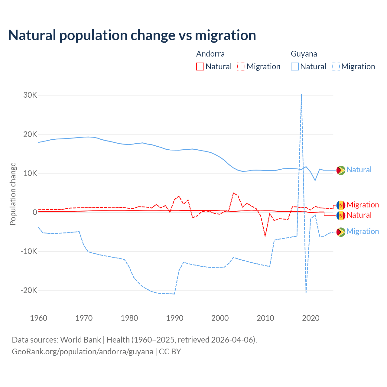 Over the last 10 years, 16.2% of the population change in Andorra is from natural causes (a gain of 1,123 people) and 83.8% is from migration (a gain of 5,802 people). In Guyana 77.7% is from natural causes (a gain of 107,419 people) and 22.3% is from migration (a loss of 30,797 people).