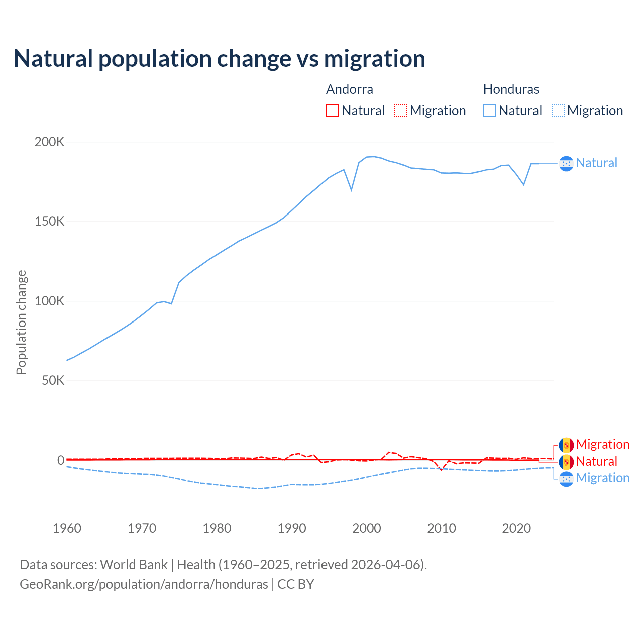 Over the last 10 years, 16.2% of the population change in Andorra is from natural causes (a gain of 1,123 people) and 83.8% is from migration (a gain of 5,802 people). In Honduras 96.7% is from natural causes (a gain of 1,821,125 people) and 3.29% is from migration (a loss of 61,965 people).