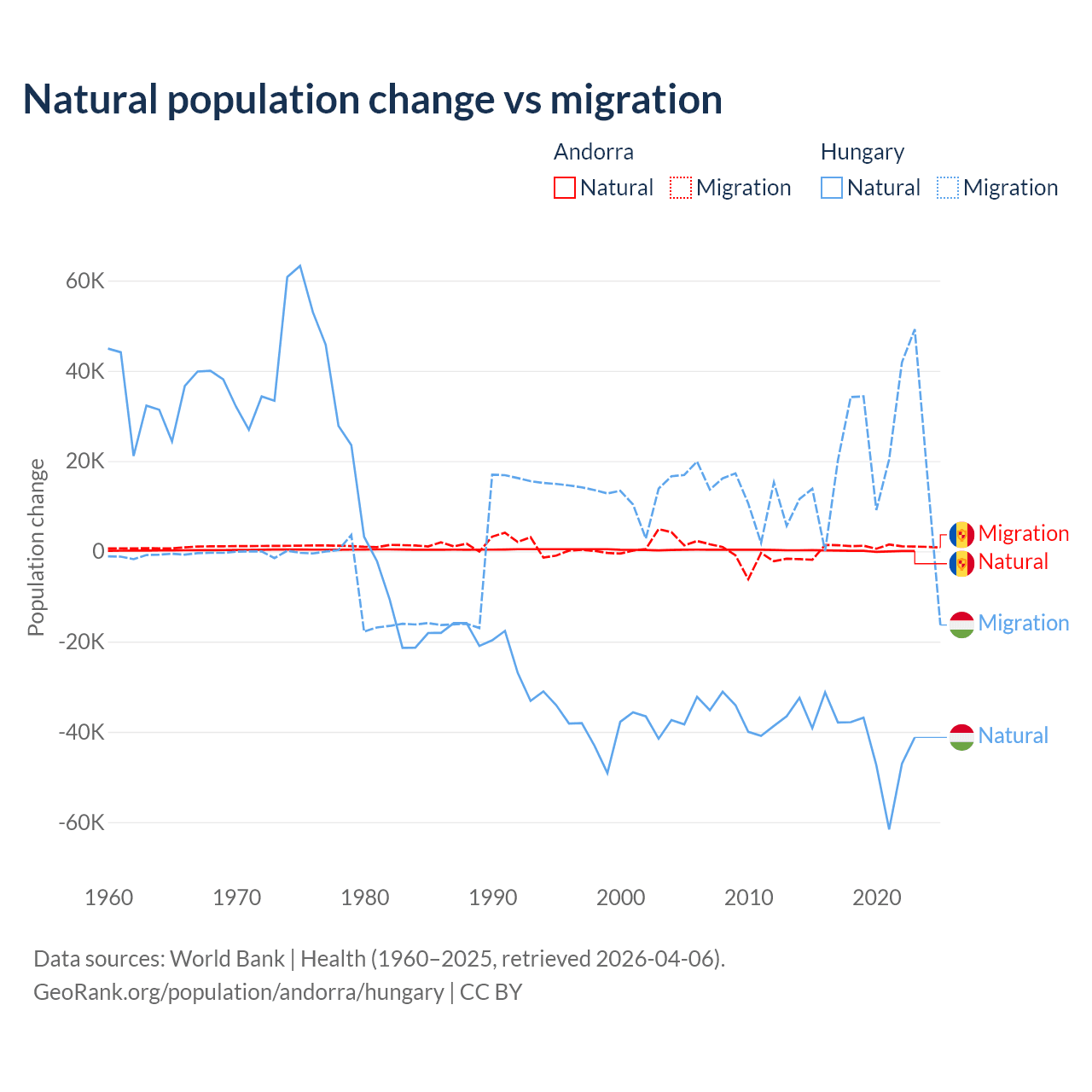 Over the last 10 years, 16.2% of the population change in Andorra is from natural causes (a gain of 1,123 people) and 83.8% is from migration (a gain of 5,802 people). In Hungary 63.7% is from natural causes (a loss of 412,838 people) and 36.3% is from migration (a gain of 234,837 people).