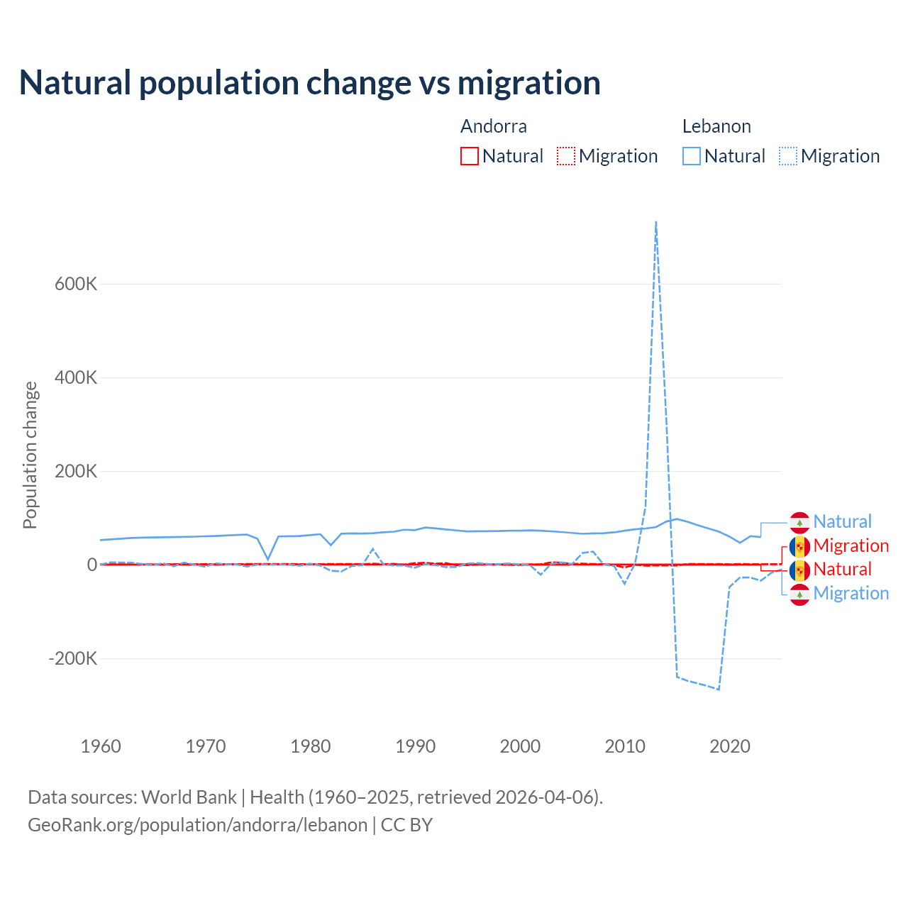 Over the last 10 years, 16.2% of the population change in Andorra is from natural causes (a gain of 1,123 people) and 83.8% is from migration (a gain of 5,802 people). In Lebanon 40.1% is from natural causes (a gain of 739,256 people) and 59.9% is from migration (a loss of 1,103,772 people).