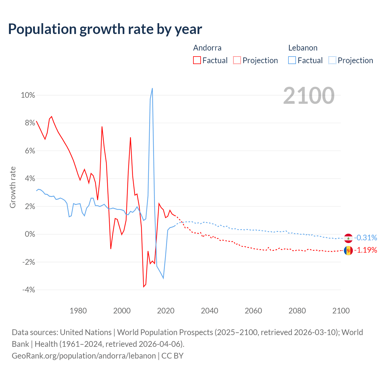 - For the last 10 years, Andorra has had an average growth rate of +0.79% per year vs +0.16% in Lebanon.