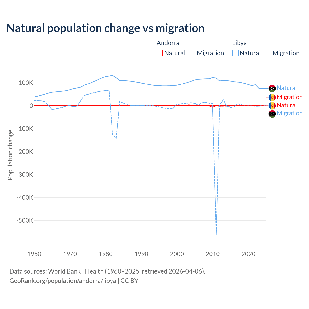 Over the last 10 years, 16.2% of the population change in Andorra is from natural causes (a gain of 1,123 people) and 83.8% is from migration (a gain of 5,802 people). In Libya 99.4% is from natural causes (a gain of 975,799 people) and 0.63% is from migration (a loss of 6,150 people).