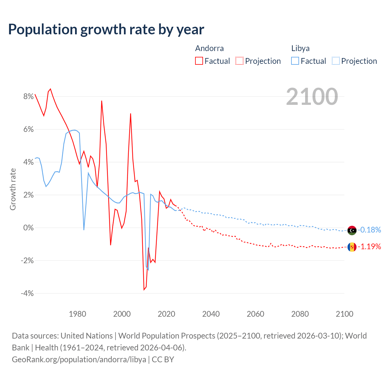 - For the last 10 years, Andorra has had an average growth rate of +0.79% per year vs +1.44% in Libya.