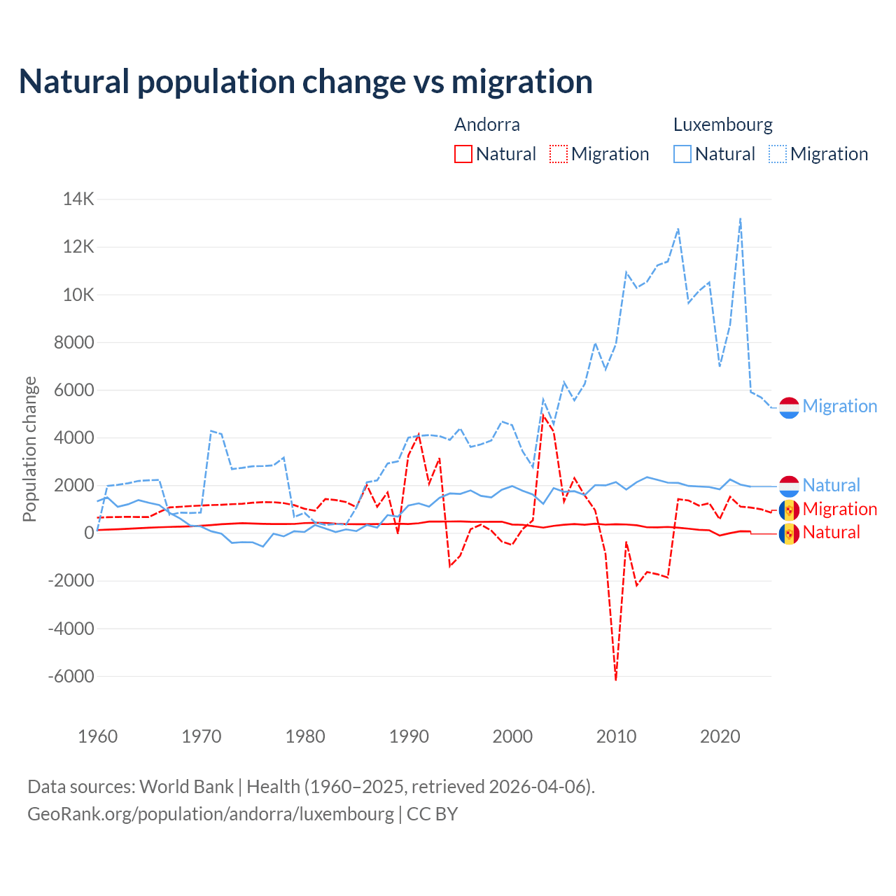 Over the last 10 years, 16.2% of the population change in Andorra is from natural causes (a gain of 1,123 people) and 83.8% is from migration (a gain of 5,802 people). In Luxembourg 16.8% is from natural causes (a gain of 20,287 people) and 83.2% is from migration (a gain of 100,435 people).