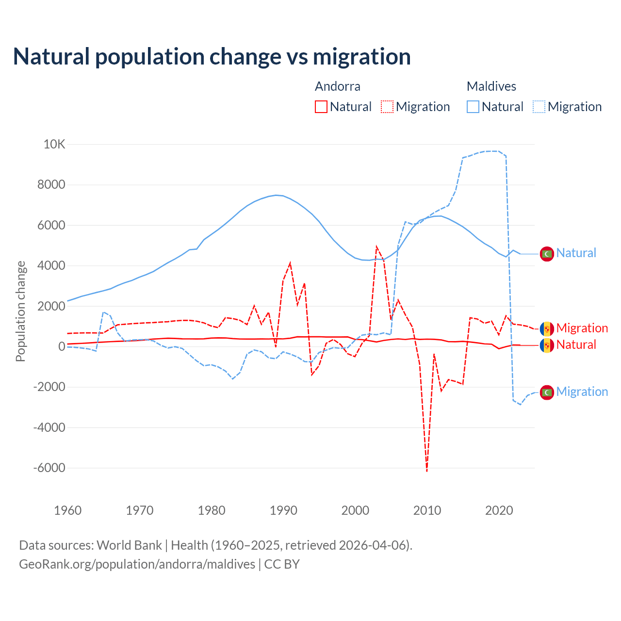 Over the last 10 years, 16.2% of the population change in Andorra is from natural causes (a gain of 1,123 people) and 83.8% is from migration (a gain of 5,802 people). In Maldives 42.7% is from natural causes (a gain of 51,342 people) and 57.3% is from migration (a gain of 68,788 people).