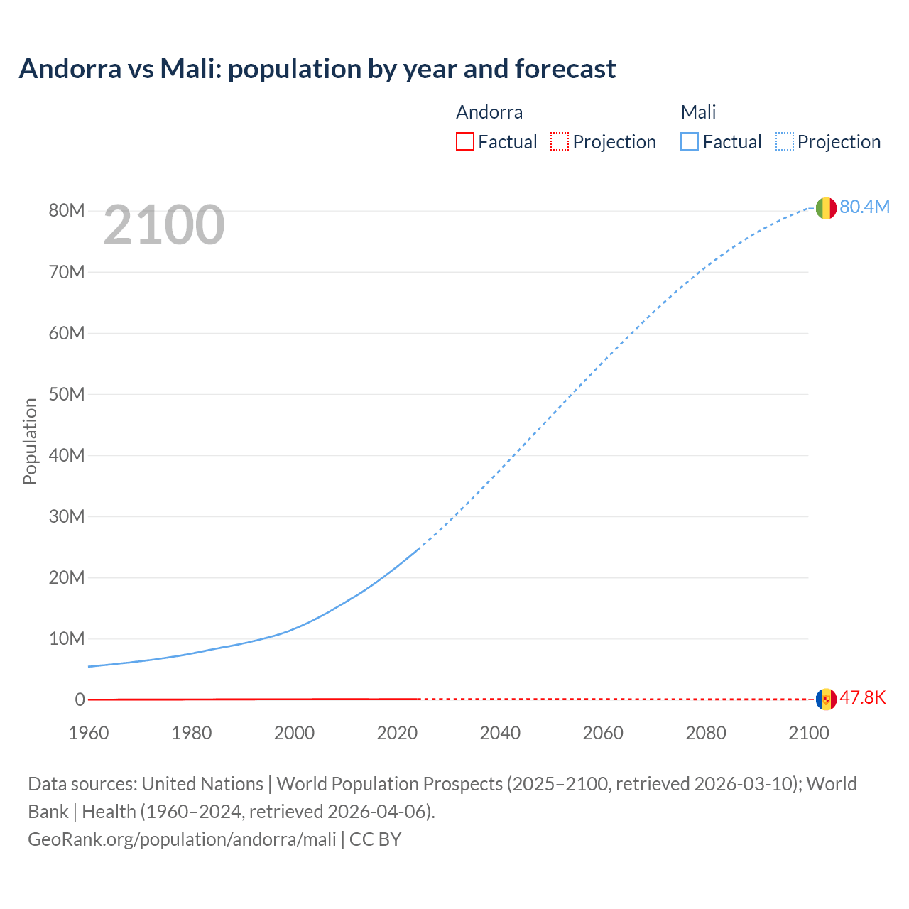The latest officially reported population of Andorra was 81,938 in 2024 vs 24,478,595 people in Mali in 2024. In 2026, based on the adjusted UN estimation, the current Andorra's population is 84,102 people compared to 26,143,152 in Mali.