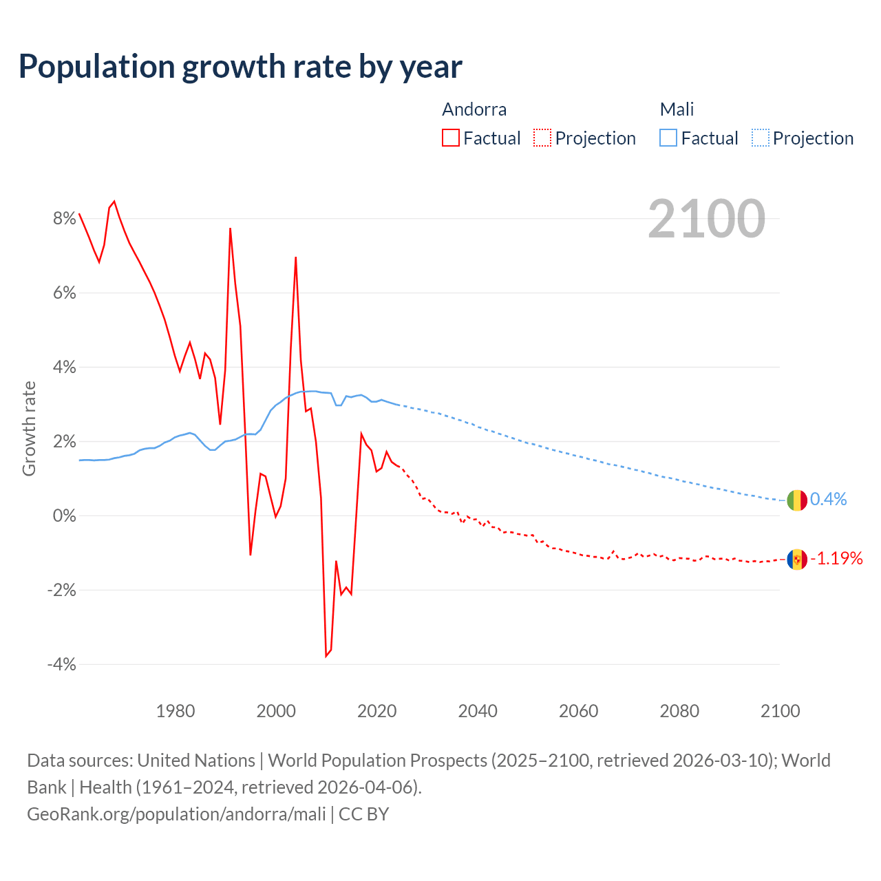 - For the last 10 years, Andorra has had an average growth rate of +0.79% per year vs +3.12% in Mali.