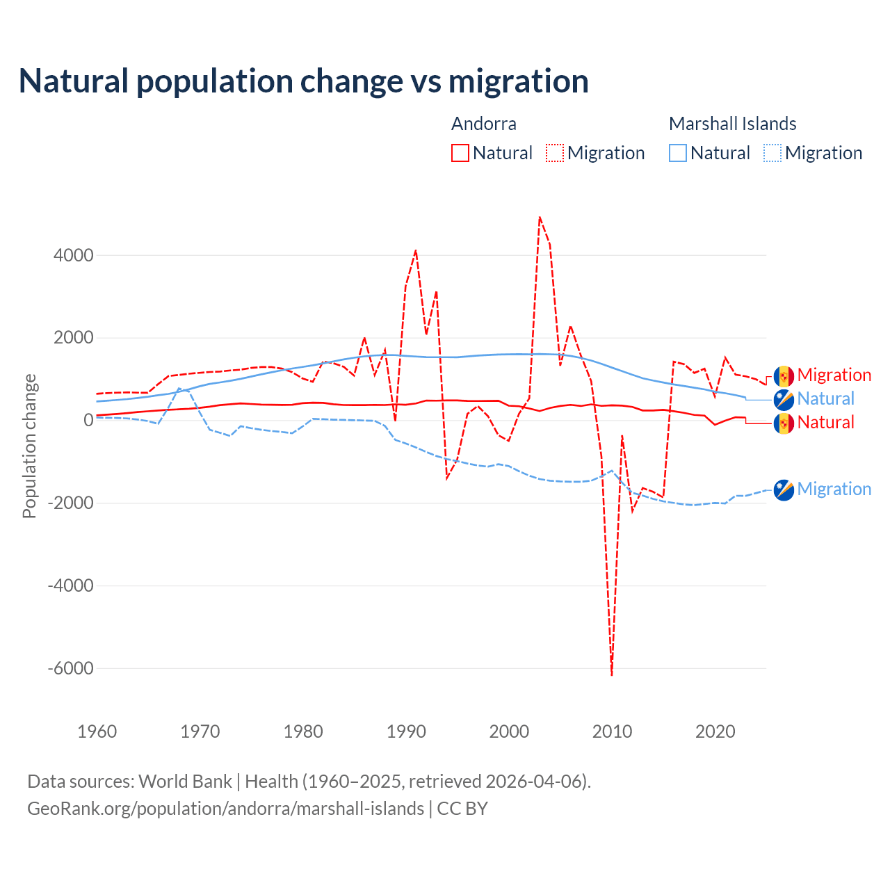Over the last 10 years, 16.2% of the population change in Andorra is from natural causes (a gain of 1,123 people) and 83.8% is from migration (a gain of 5,802 people). In the Marshall Islands 27.8% is from natural causes (a gain of 7,592 people) and 72.2% is from migration (a loss of 19,682 people).