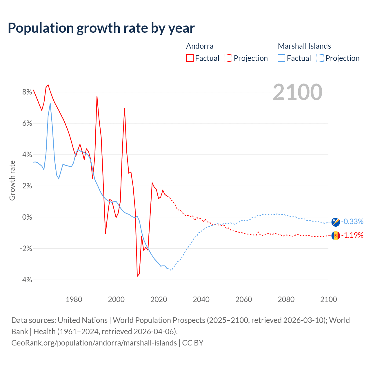 - For the last 10 years, Andorra has had an average growth rate of +0.79% per year vs -2.69% in the Marshall Islands.