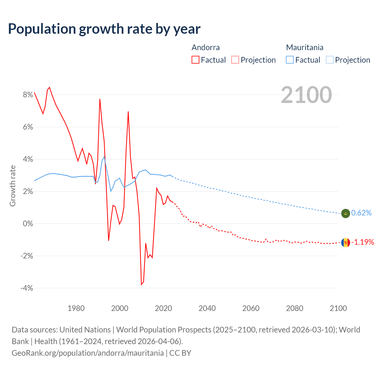 - For the last 10 years, Andorra has had an average growth rate of +0.79% per year vs +3% in Mauritania.