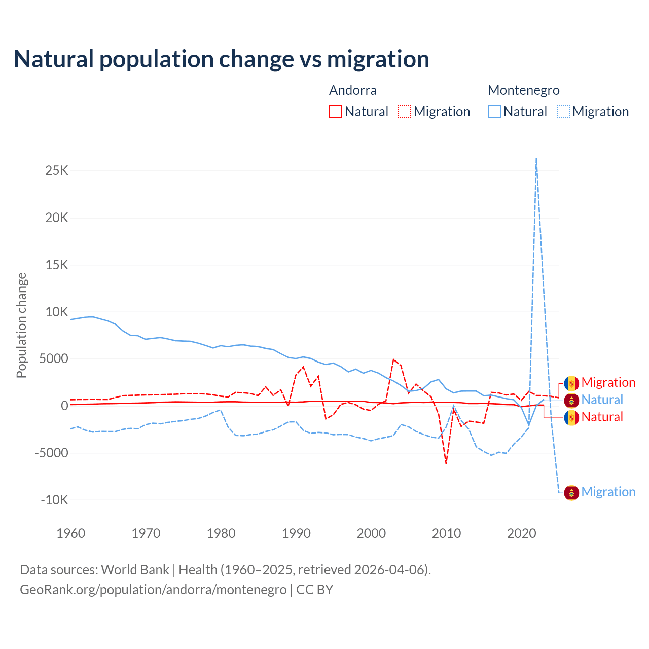 Over the last 10 years, 16.2% of the population change in Andorra is from natural causes (a gain of 1,123 people) and 83.8% is from migration (a gain of 5,802 people). In Montenegro 52.4% is from natural causes (a gain of 4,501 people) and 47.6% is from migration (a gain of 4,095 people).