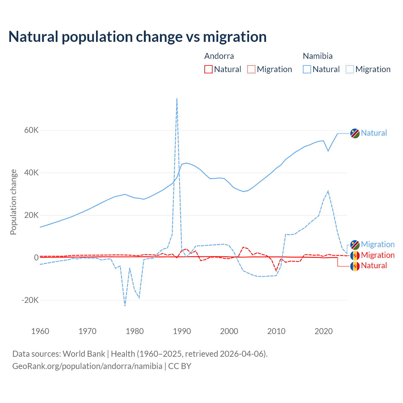 Over the last 10 years, 16.2% of the population change in Andorra is from natural causes (a gain of 1,123 people) and 83.8% is from migration (a gain of 5,802 people). In Namibia 74.3% is from natural causes (a gain of 532,532 people) and 25.7% is from migration (a gain of 183,837 people).